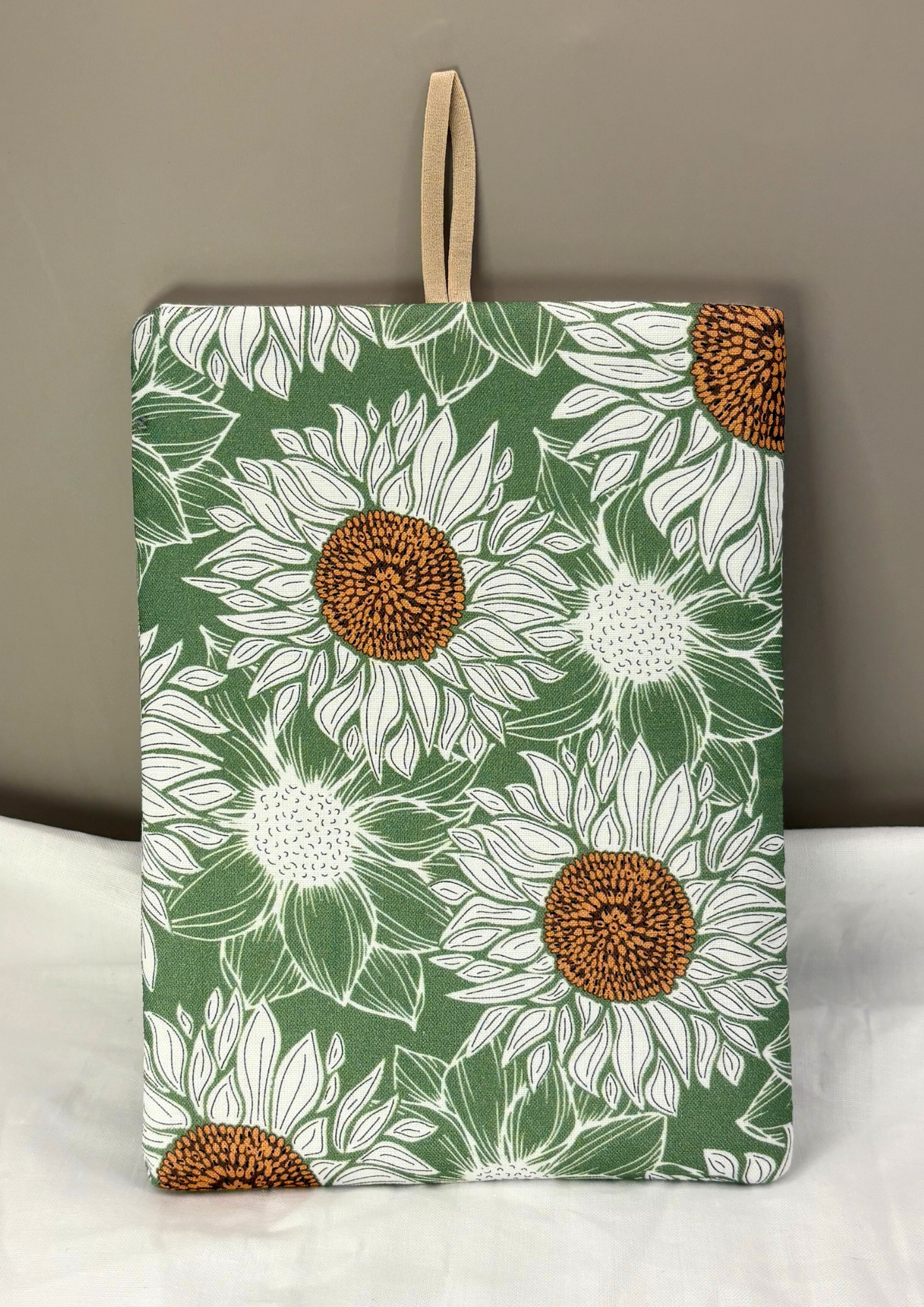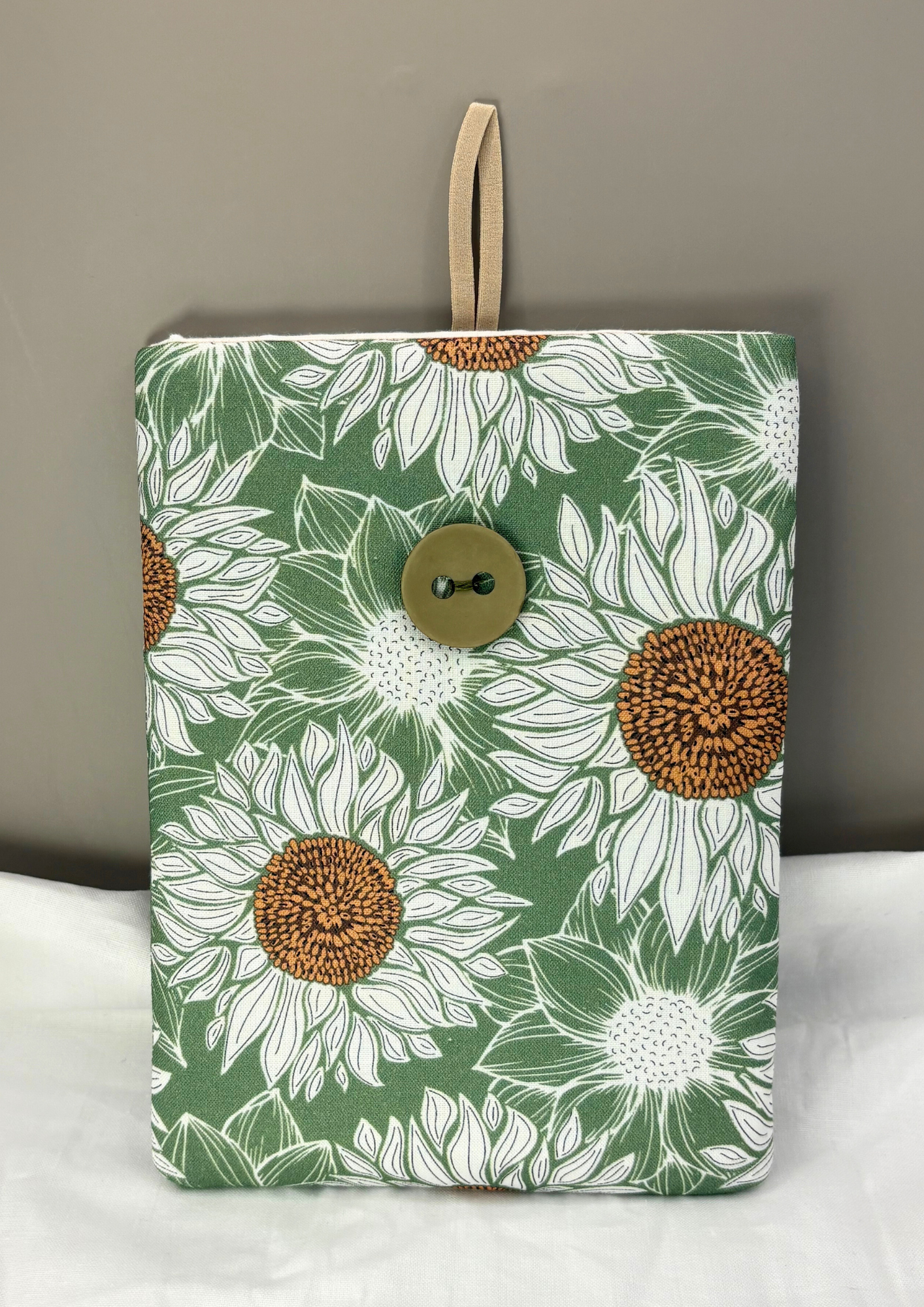 Featuring a print with white sunflowers, this case has a brown button, brown elastic and a white interior.