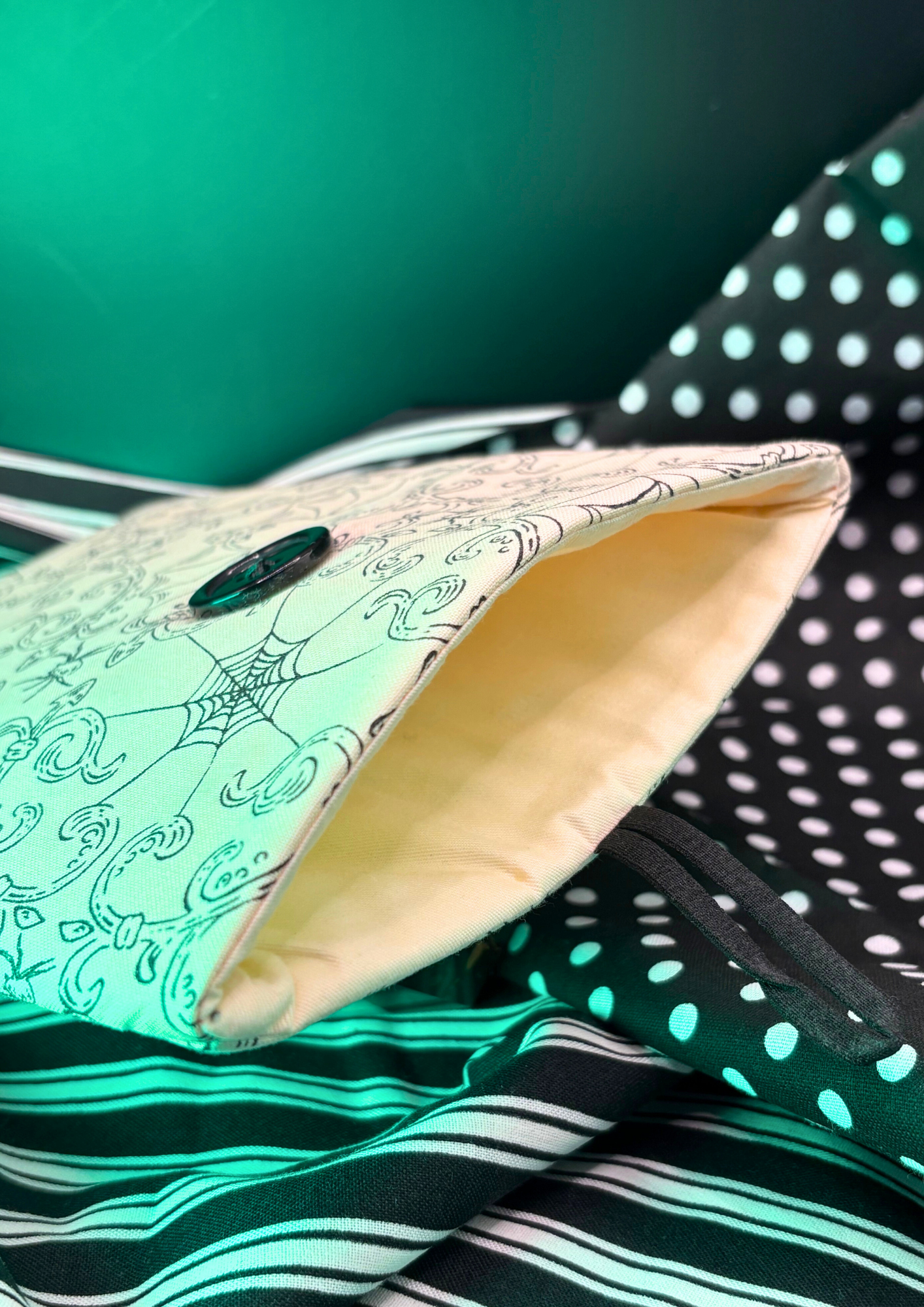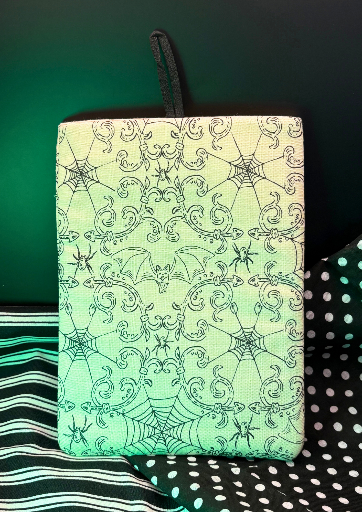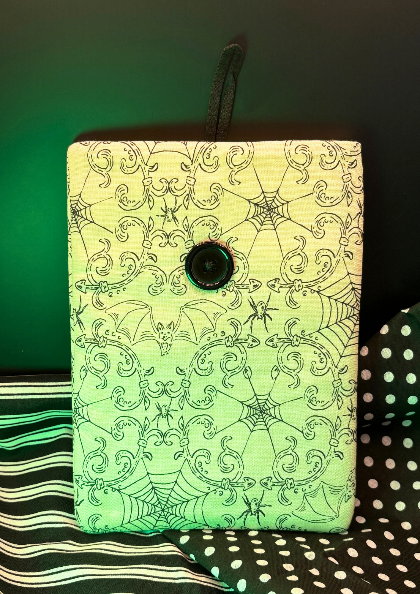 Celebrate the season with this Halloween-inspired sleeve, featuring a cream fabric with adorable spiders and bats. With a black button, black elastic, and cream interior, it’s ready to cradle your device in spooky style.
