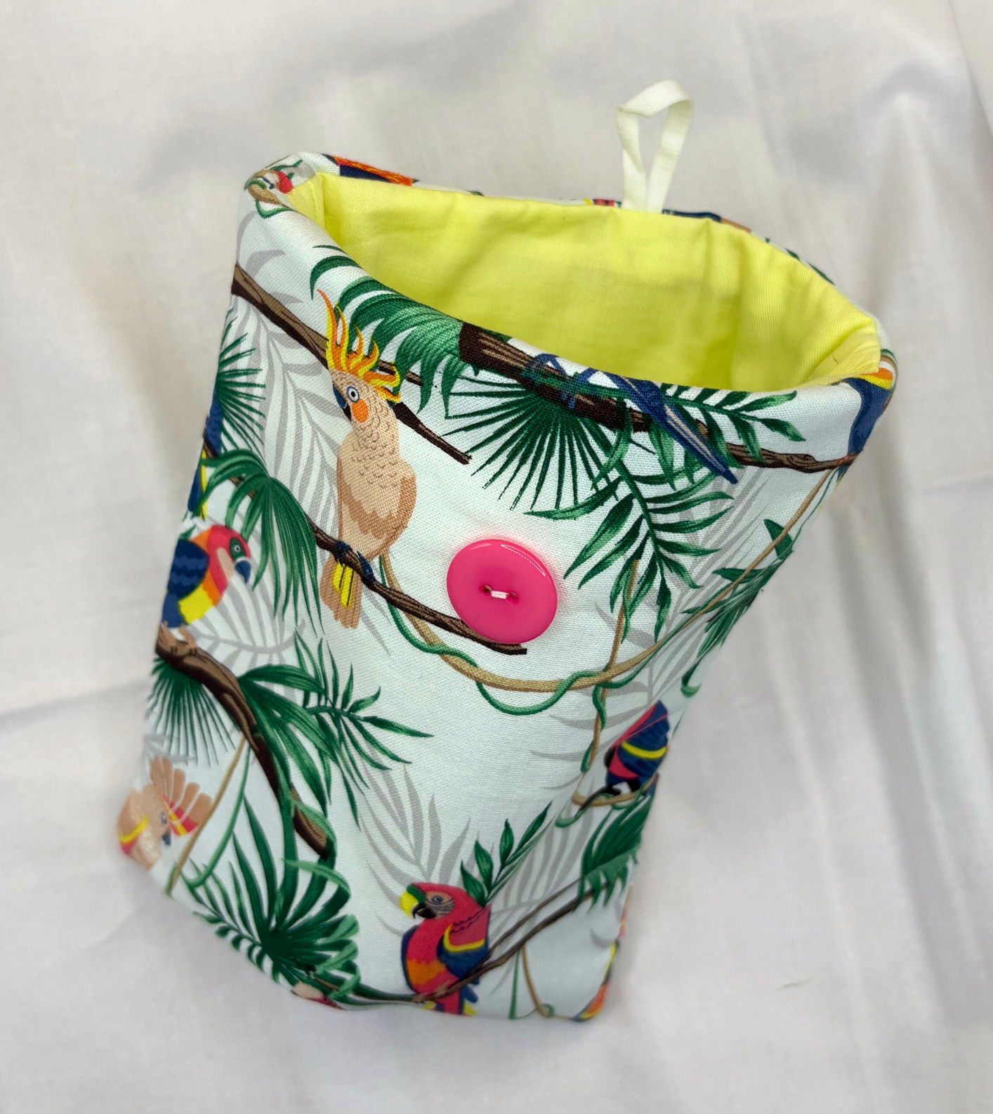 Featuring vibrant birds, this case has a pink button, white elastic and a light yellow interior.
