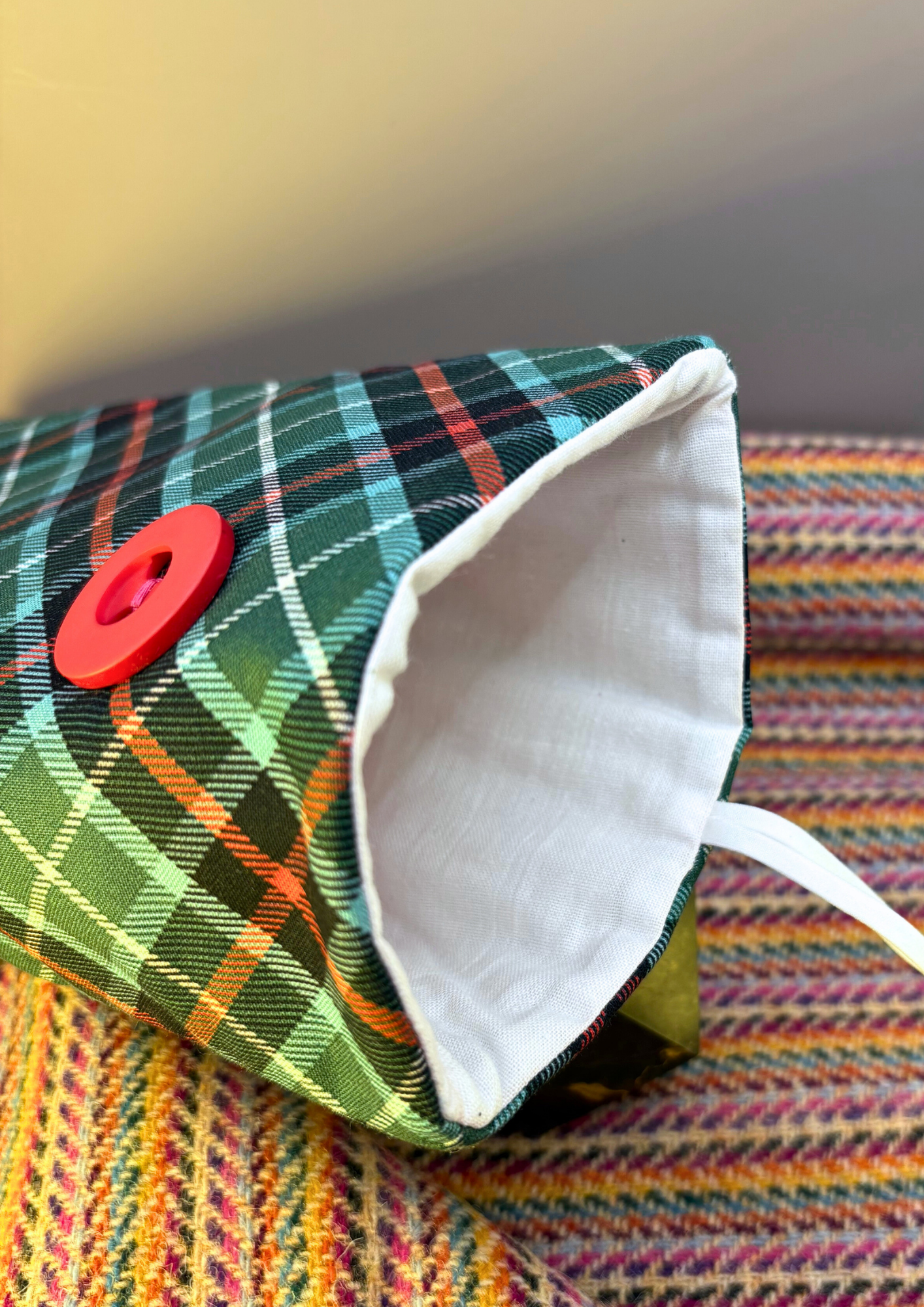 Featuring a print in festive plaid, this case has a red button, white elastic and a white interior.