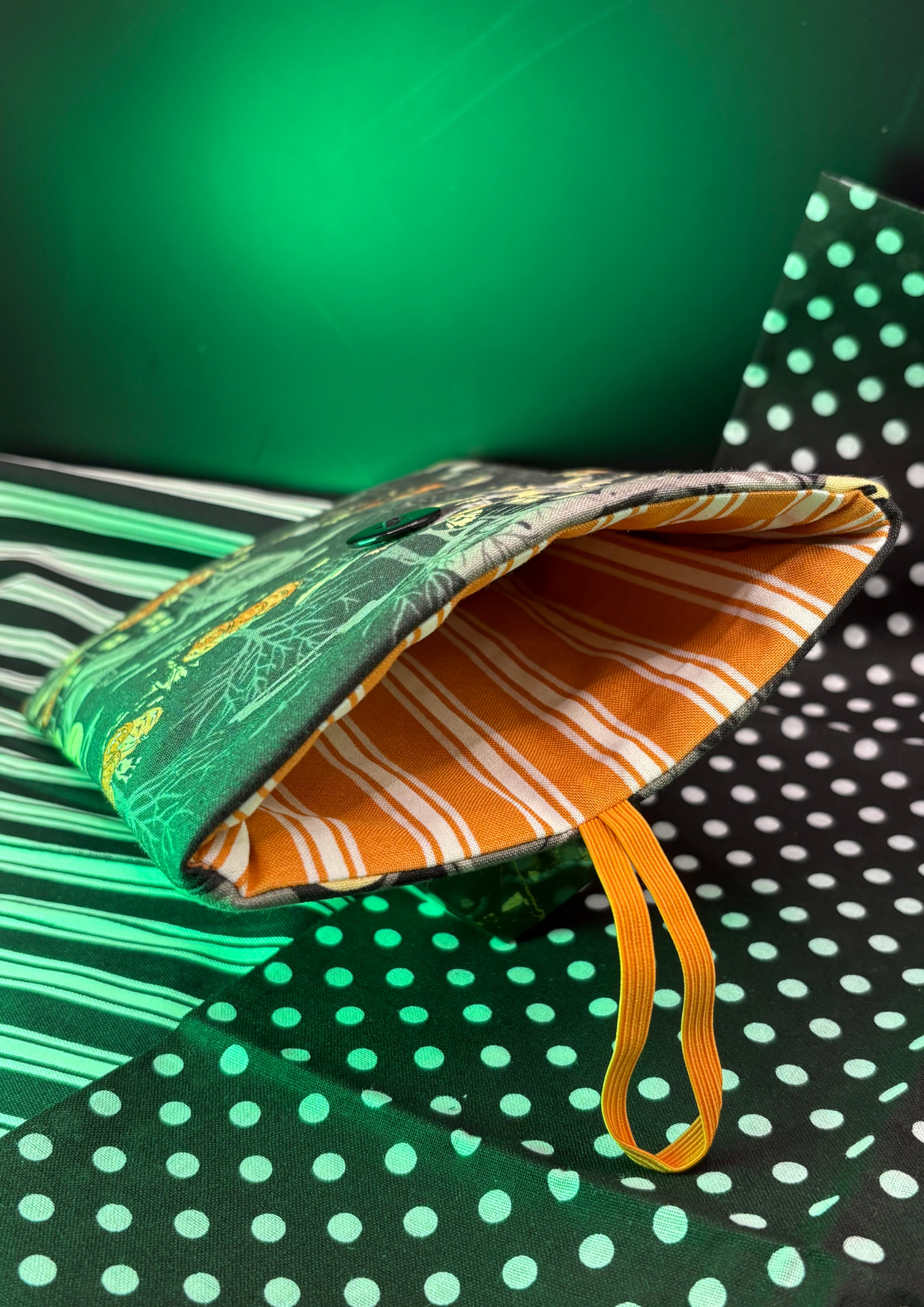 Celebrate the season with this Halloween-inspired sleeve, featuring a print with haunted buildings and sleepy little pumpkins. With a black button, orange elastic, and a glow-in-the-dark striped orange interior, it’s ready to cradle your device in spooky style.