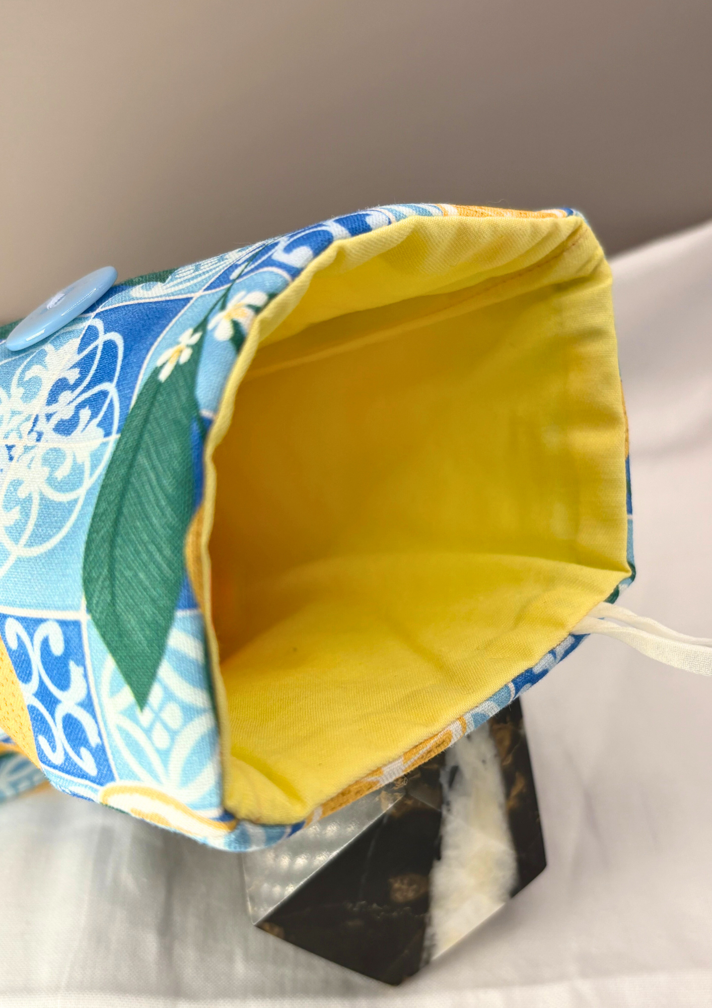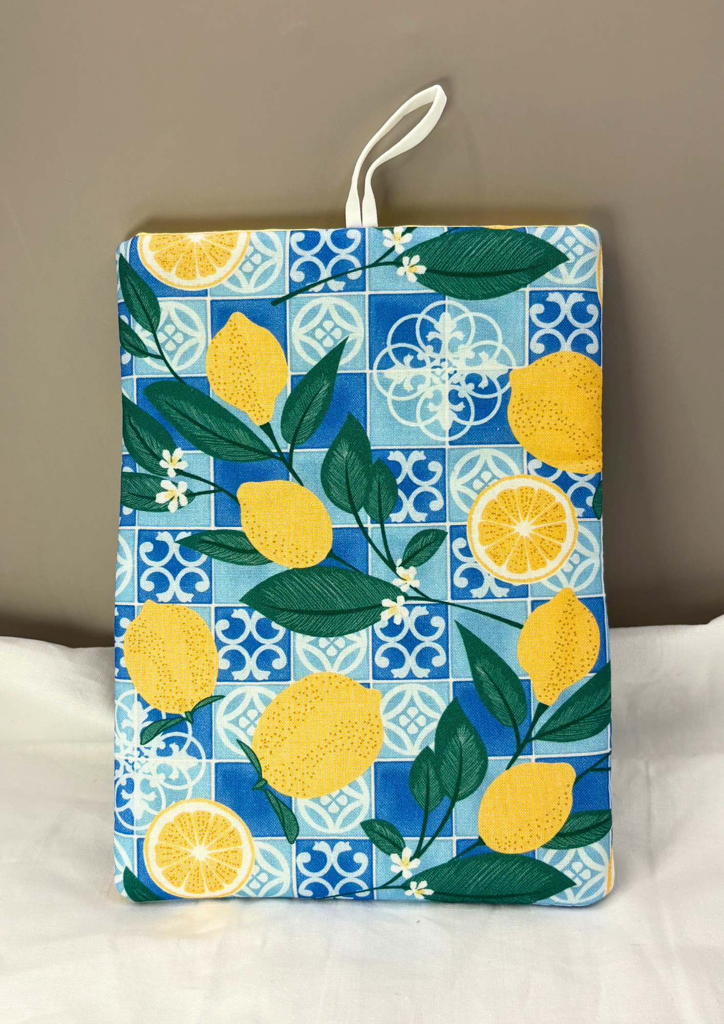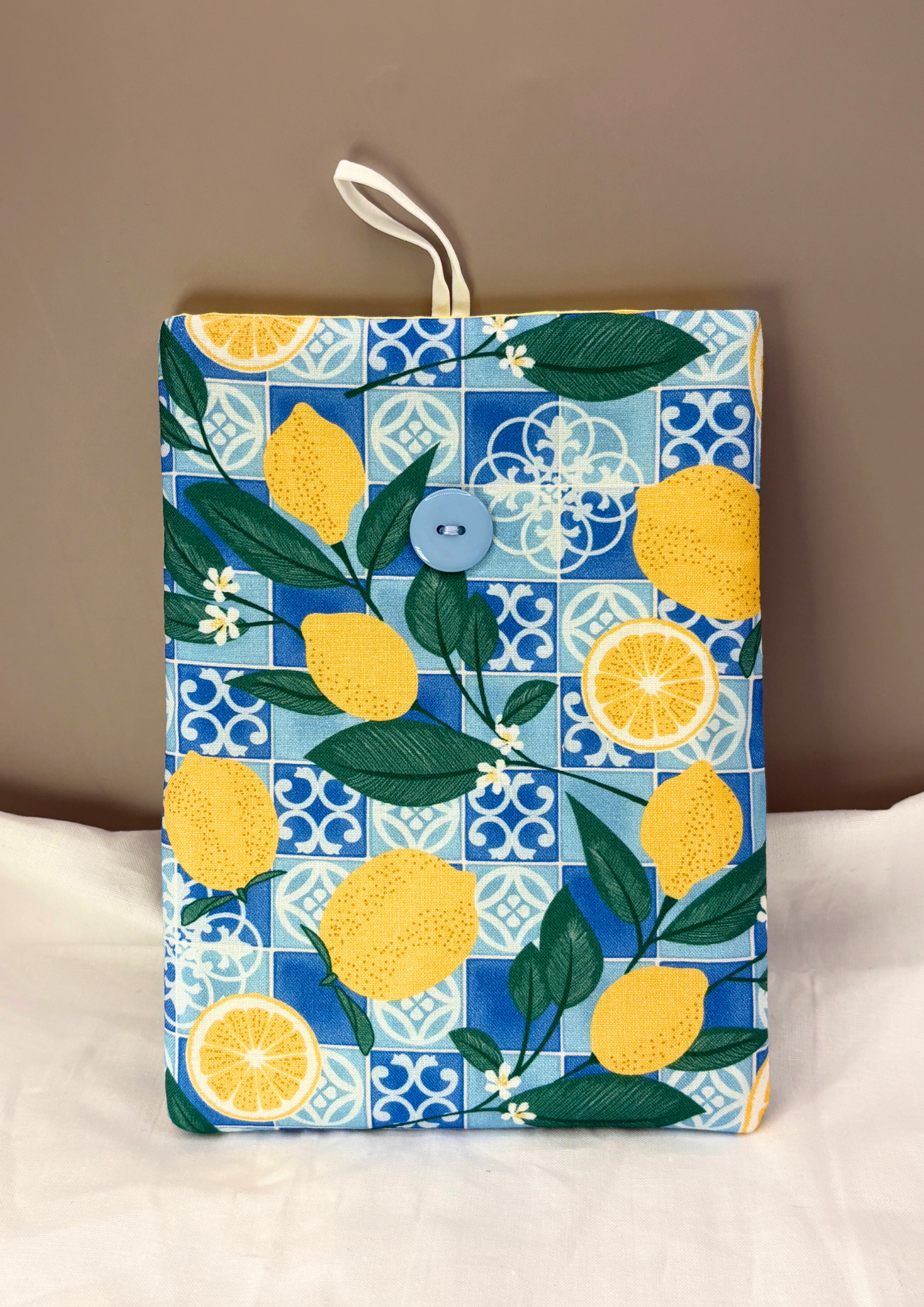 Featuring a print with lemons and a blue tiled pattern, this case has a blue button, white elastic and a yellow interior.