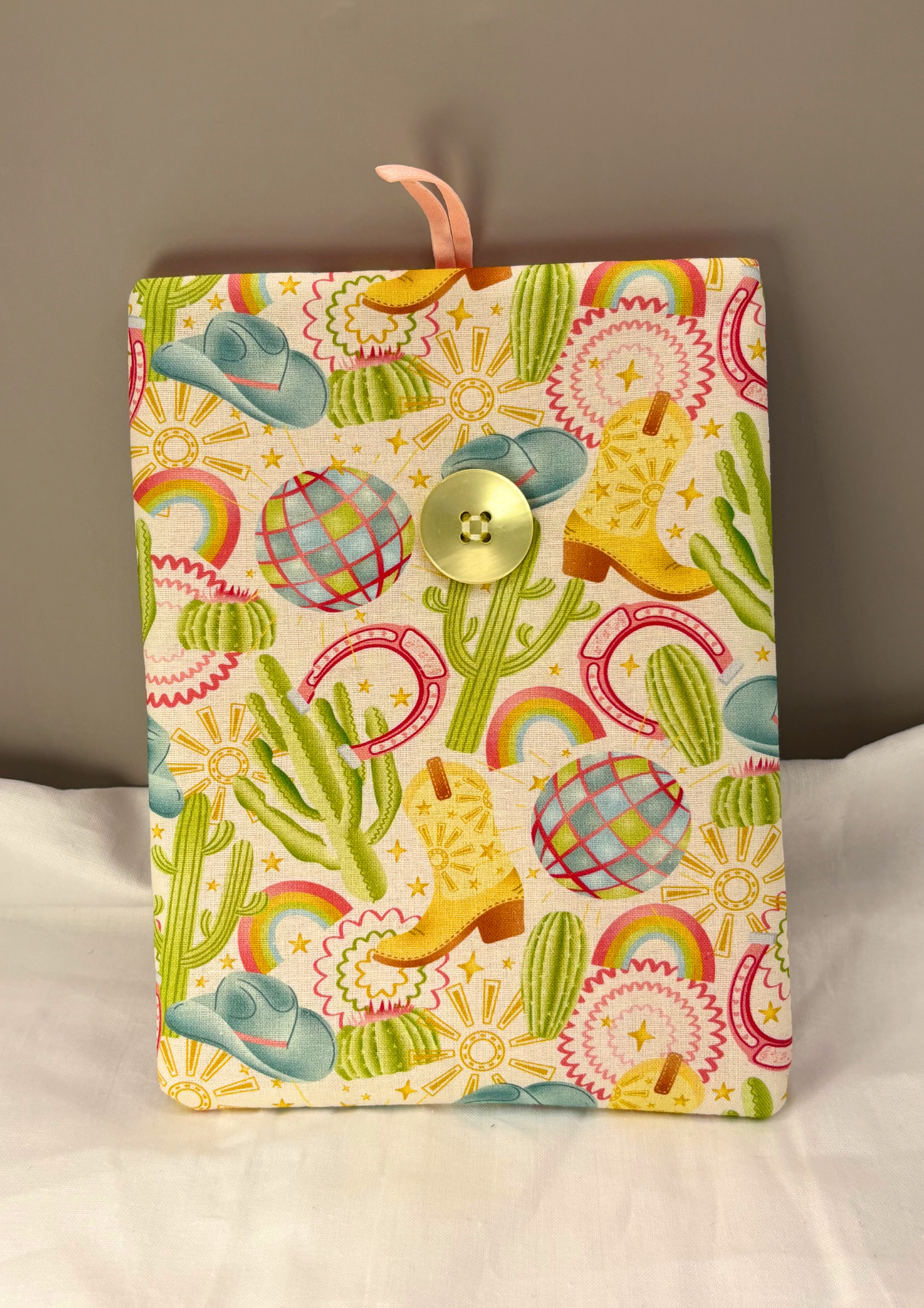 Featuring a print with cowboy boots, horseshoes and disco balls, this case has a shiny yellow button, pink elastic and a pink interior. We all know the rules - you wear the hat...