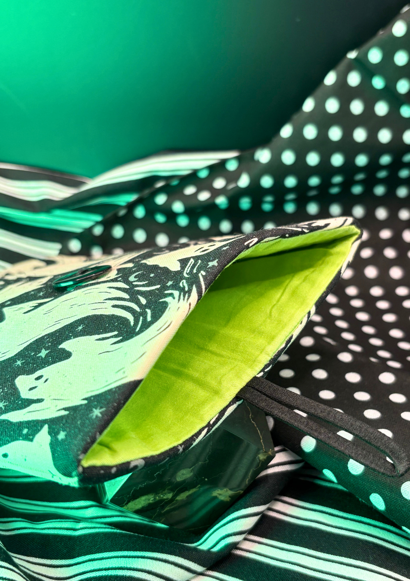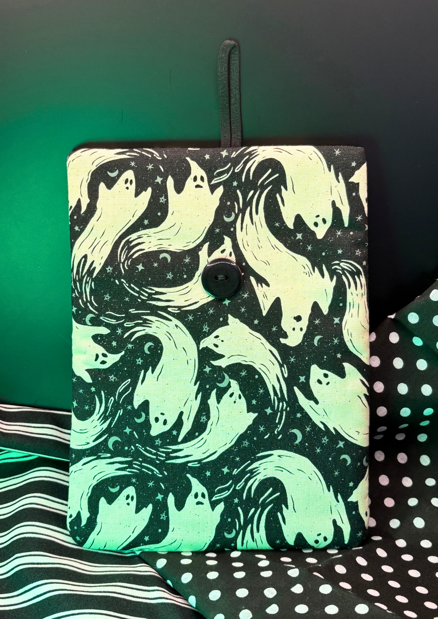 Celebrate the season with this Halloween-inspired sleeve, featuring ghosts and grey stars. With a black button, black elastic, and bright green interior, it’s ready to cradle your device in spooky style.